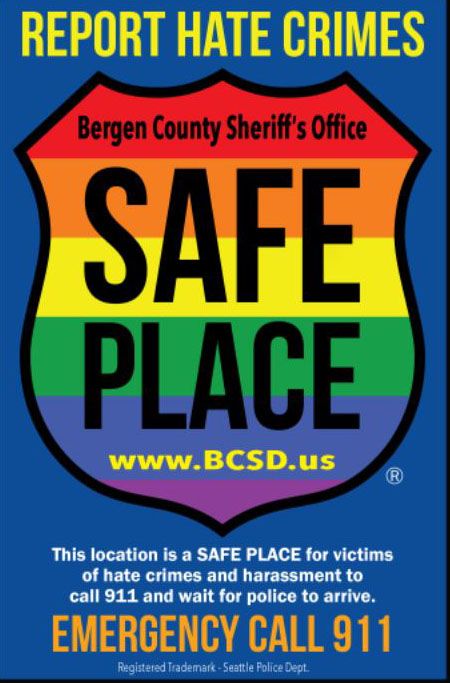 Locations displaying the BCSO SAFE PLACE decal assume responsibilities that will assist Bergen County Law Enforcement agencies in protecting anti-LGBTQ+, Bias/Hate crimes and school bullying victims.